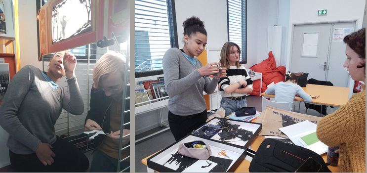Ils ont recours à cette technique d'animation pour une partie de leur film. Ils ont préparé les silhouettes nécessaires et installé le plateau de tournage au CDI avec l'aide de Lou-Anna Reix, réalisatrice et intervenante de l'option cette année.